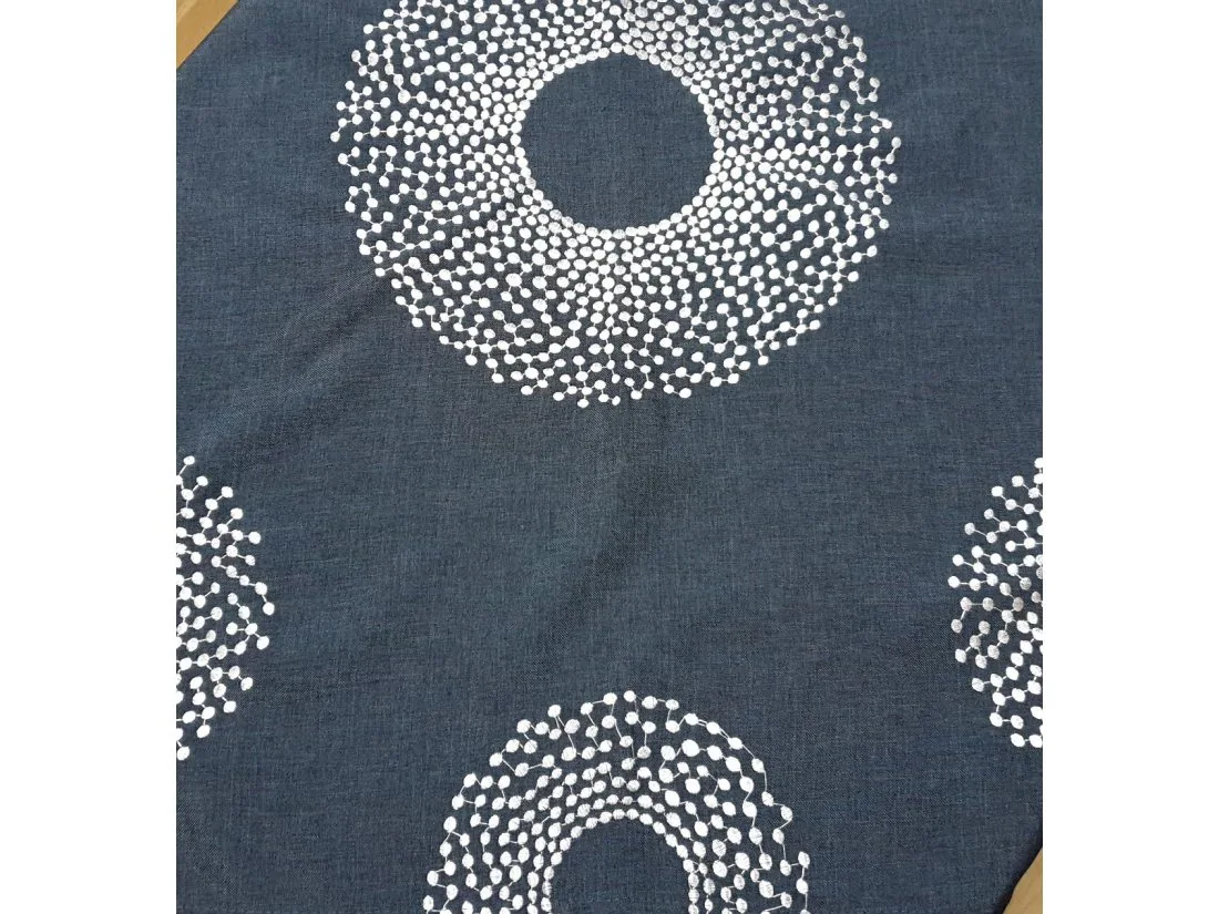Haftowany bieżnik w kształcie kwadratowym Popielate Kółka w rozmiarze 85 x 85 cm został wykonany z tkaniny 100 % poliestrowej w kolorze grafitowym z fantazyjna haftowaną aplikacją popielatych kółek, kropek.